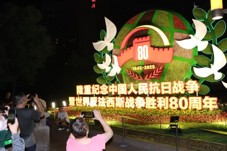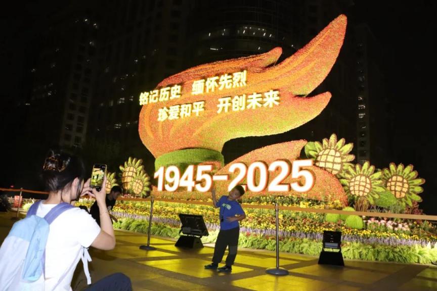 8月20日龙辉优配,北京长安街沿线,中国人民抗日战争暨世界反法西斯战争胜利80周年主题花坛亮灯,让我们一同领略。